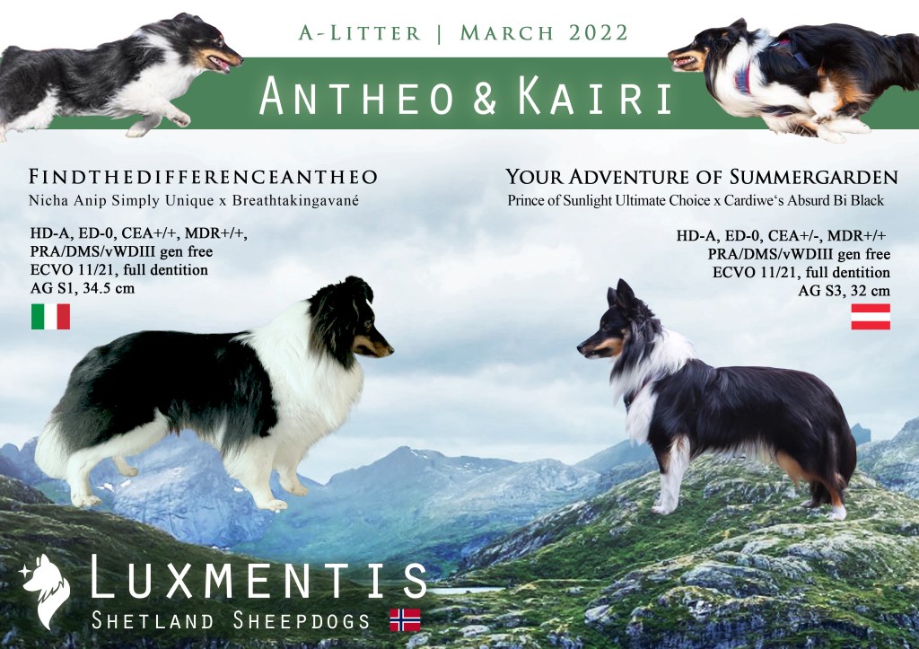 We expect our first sheltie litter! I have been a sheltie nerd for several years already, studying lines, dogs and health results of Shelties all over the world. I know that every line has it’s fault and that the perfect Sheltie doesn’t exist. Finding the right male for Kairi wasn’t easy but I think I came to my ideal as close as it can get. Antheo is a grandson of Shawnee of Summergarden, well-known in the agility world for his explosive and high-drive offspring. Antheo is from Italian “working lines”, meaning that many individuals have proven good working capacity (as real working lines doesn’t exist in Shelties). Some years ago, I fell in love with his aunt Bet from Marco Giavoni, who is a daughter of Shawnee. And there is also Cika from Akuna x Anip, a small sable bitch with tons of potential. Theo’s father Anip has produced a lot of good Shelties, like Meryl of Pavol Vakonic or Lolita of Giulia Zurma. When meeting Theo, it was like a match made in heaven. He really is the male version of Kairi, being superfriendly to strangers and jumping into the air when excited. He has an athletic body and a flat running style. But the most important thing are his flawless health results. He is x-rayed free for hips, elbows and is genetically free for the relevant Sheltie diseases. Thank you so much Saverio and Silvia for making this combination possible and to Kairi’s breeder Tamara for always being there for us.